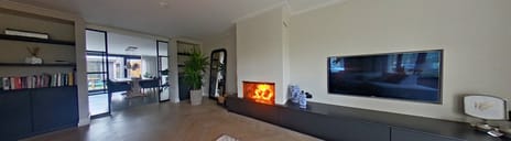 De woonkamer is voorzien van een prachtige visgraatvloer, serene kleurtinten en een ruime erker die zorgt voor veel lichtinval, daarnaast is er nog een sfeervolle openhaard aanwezig. De fraaie stalen deuren scheiden de living van de woonkeuken.