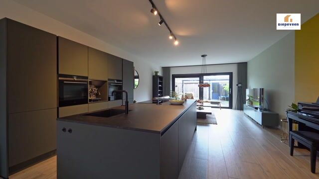 Via een zwarte paneeldeur met glas betreden we de open keuken en woonkamer. De luxe keuken (2023) bevindt zich centraal in de leefruimte en vormt daarmee het hart van de woning: een plek waar koken, wonen en gezelligheid samenkomen. Dankzij deze opstelling staat u tijdens het koken altijd in contact met het woon- en eetgedeelte, wat de ruimte een open en uitnodigend karakter geeft. De keuken bestaat uit een moderne, rechte opstelling met een royaal kook- en spoeleiland, uitgevoerd met fronten in een warme groene kleur en een keramisch aanrechtblad.