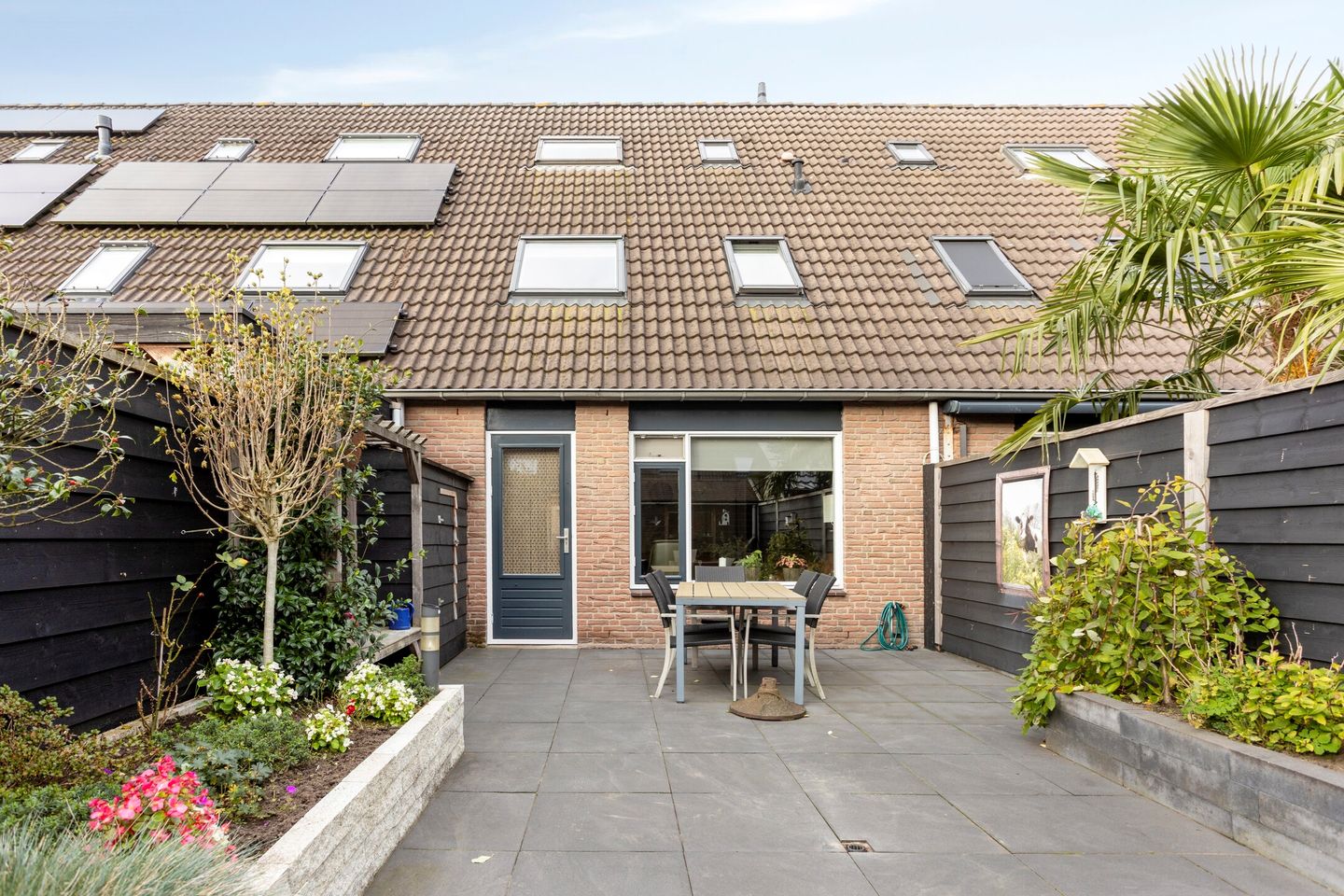 Achter de woning ligt een onderhoudsvriendelijke, zonnige tuin met een fraaie mix van bestrating en groen. Dankzij de gunstige ligging geniet u hier van veel zonuren. Op het terras creëert u eenvoudig een gezellige loungeplek of eetgedeelte. Achterin de tuin bevindt zich een berging met voldoende ruimte voor fietsen of tuinspullen, en via de achterpoort is de tuin ook achterom bereikbaar – praktisch en veilig.