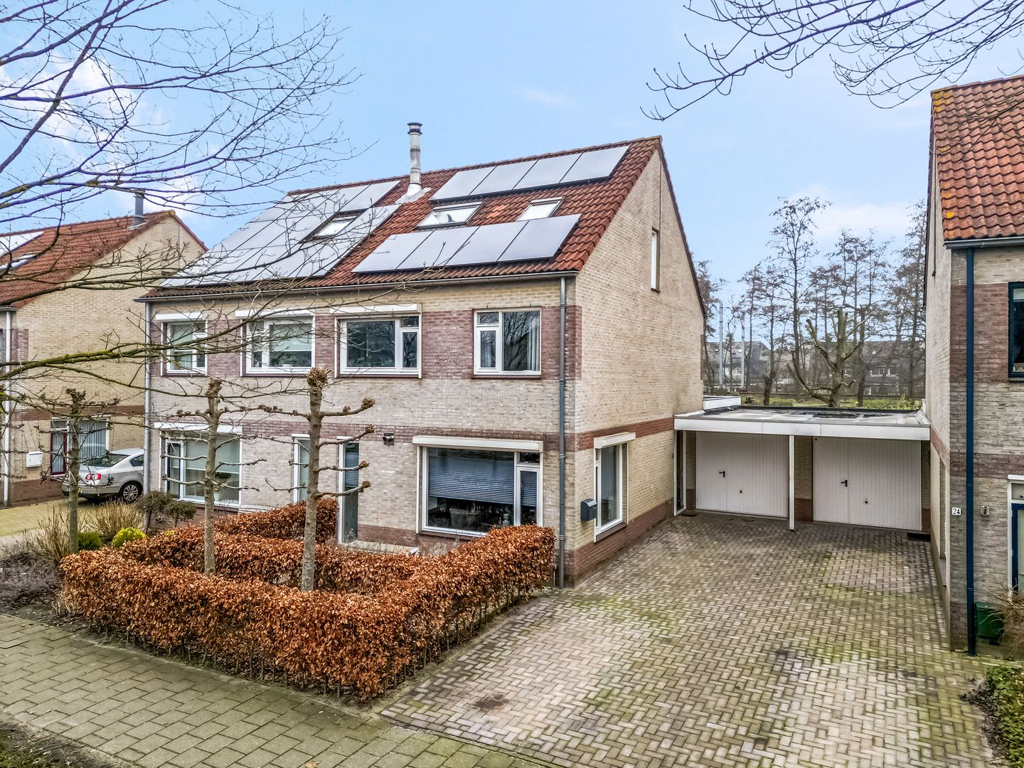 Aan de voorzijde van het huis heb je de beschikking over een diepe oprit, die plaats biedt aan meerdere auto’s en toegang geeft tot de garage/berging. De voortuin is smaakvol aangelegd en ingericht met beukenhagen, 2 leilindes, hortensia’s en split.