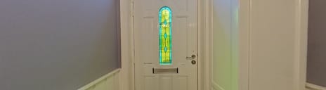 Begane grond: vanaf de rustige straat bereiken we de netjes aangelegde voortuin van deze charmante twee-onder-een-kapwoning. Via het sierlijke tuinpad lopen we richting de stijlvolle entree, waar de voordeur met getoogd raam en het bovenlicht met glas-in-lood direct de authentieke sfeer van het bouwjaar verraden – een prachtig detail dat meteen de toon zet.