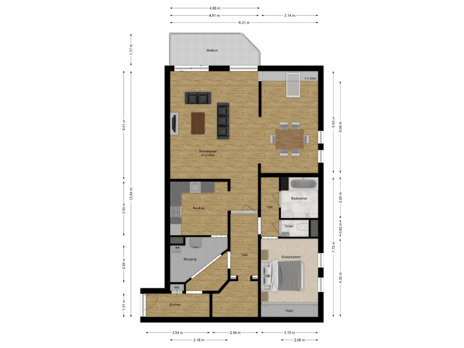 U komt het appartement binnen in de hal, welke u toegang biedt tot de garderobe, de meterkast, de berging en de woonkamer met open keuken. Tevens is er een extra werk- of bergruimte bereikbaar vanuit de hal.