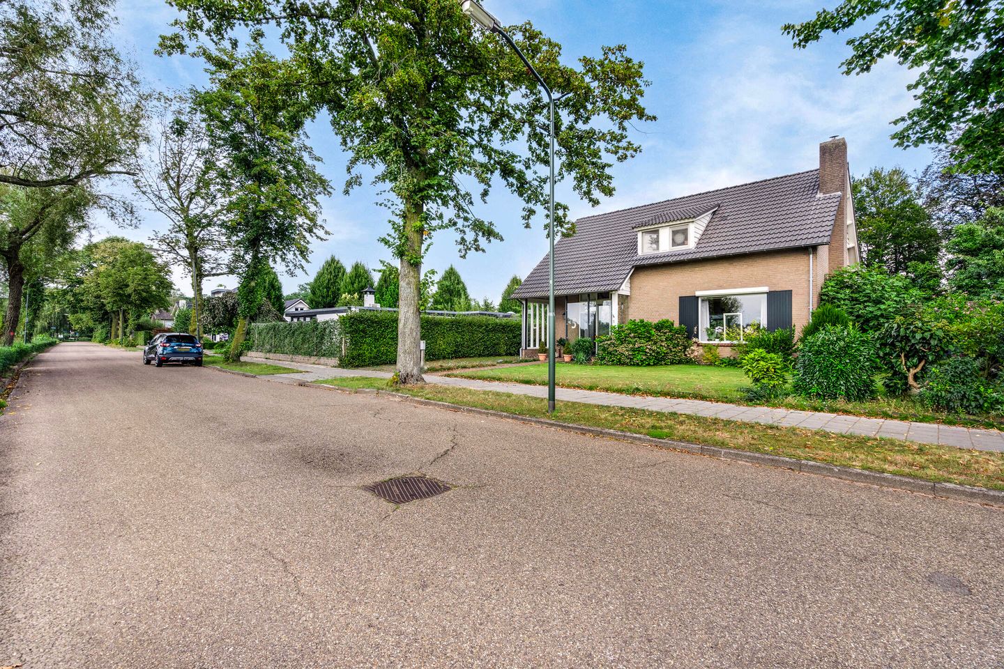 De woning ligt op een royaal perceel met een ruime voor- en achtertuin. De voortuin is voorzien van een gazon en diverse vaste beplanting, wat zorgt voor een sfeervolle entree. De lange oprit biedt volop parkeerruimte en leidt naar de carport en de garage.