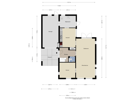 Betreed de woning via de overdekte entree die leidt naar de ruime hal. De hal is voorzien van een toilet, trapopgang en, uiteraard, deur naar de woonkamer. De woonkamer is lekker licht doordat ze aan drie zijden is voorzien van ramen. Ze heeft een schuifpui en biedt toegang tot de separate studeer / werk / speelkamer. Aan de tuinzijde bevindt zich de keuken; deze is voorzien van een nette inrichting in rechte opstelling met dubbele spoelbak en van inbouwapparatuur; te weten: vaatwasser, combi magnetron/oven, koelkast en inductie kookplaat. Via de keuken is de betegelde bijkeuken bereikbaar. Deze beschikt over aansluitingen voor witgoed en over een toegang naar de garage (die is dus inpandig bereikbaar).