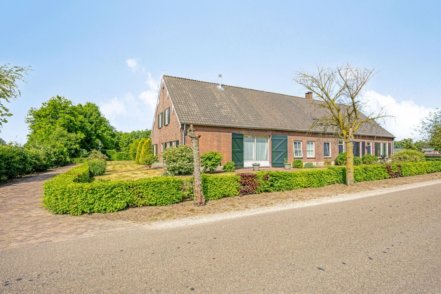 De woning is fraai gelegen aan een rustige weg, met een nette voortuin voorzien van gazon, volwassen struiken en heggen. De lange oprit biedt volop parkeergelegenheid voor meerdere auto’s.