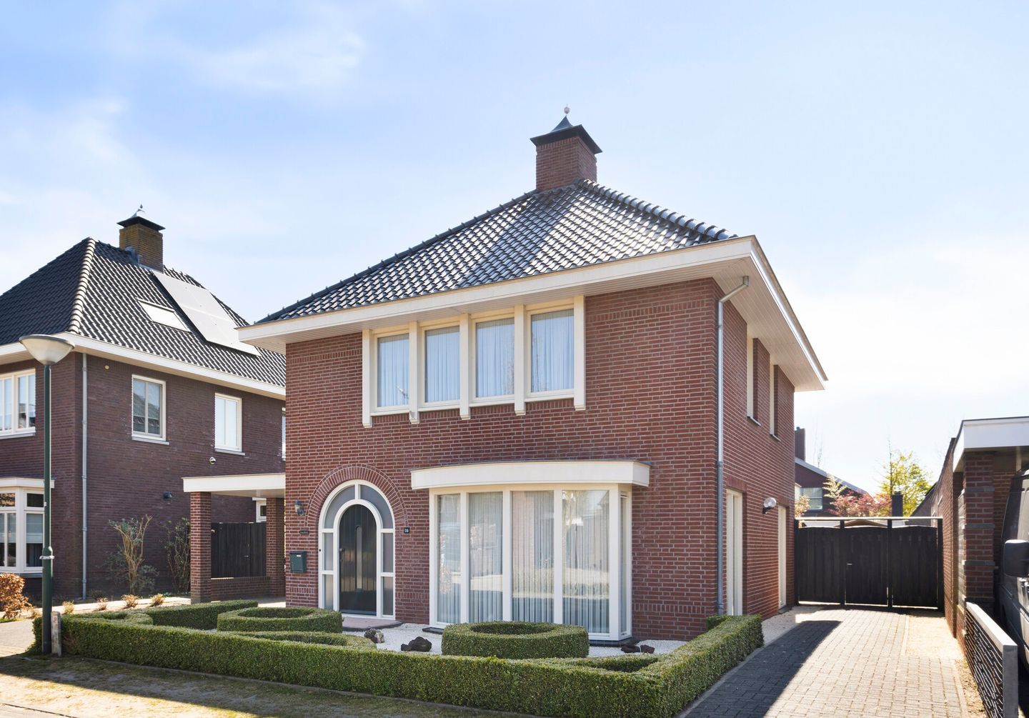 De keurig aangelegde voortuin met buxusvormen en grind geeft de woning een statige uitstraling. Links van de woning ligt de oprit met carport (voorzien van lichtkoepel), rechts is een tweede oprit met toegang tot de achtertuin via een poort.