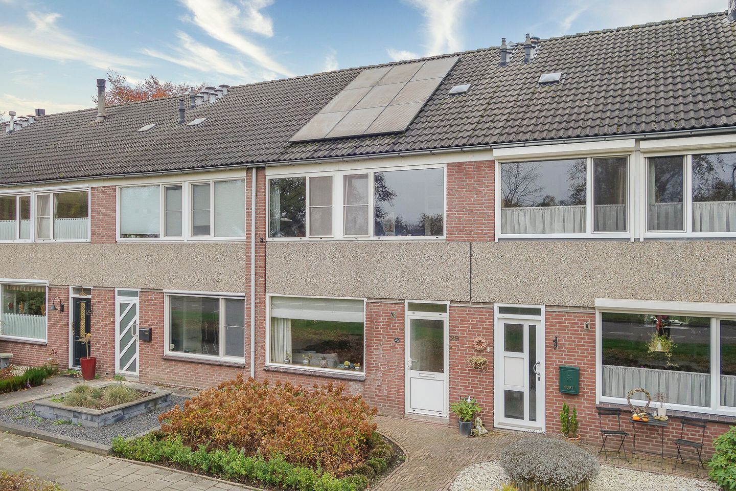 Gunstig in groene en kindvriendelijke omgeving gelegen, uitgebouwde royale tussenwoning met garage en overdekt terras in de op het westen gesitueerde achtertuin. De goed geïsoleerde gezinswoning (Energielabel A) is uitgevoerd met dubbele beglazing en 15 zonnepanelen. Bouwjaar: 1975 Woonoppervlakte: circa 123 m2 Oppervlakte garage: circa 16 m2 Inhoud woning: circa 429 m3 Inhoud garage: circa 51 m3 Perceeloppervlakte: 160 m2 Begane grond: Via de verzorgde voortuin is de entree/hal bereikbaar. De hal, met meterkast en garderobe, geeft u toegang tot de living. De living is onderverdeeld in een zitgedeelte en een eetgedeelte met een halfopen keuken. De keuken, met voldoende bergruimte, is ingericht met een vaatwasser, oven, quooker, inductiekookplaat en afzuigkap. De living wordt middels grote ramen en openslaande deuren naar de achtertuin van veel daglicht voorzien. Aansluitend aan het eetgedeelte komt u in een portaal dat toegang geeft tot de achtertuin en een toiletruimte. De op de zonzijde gesitueerde tuin, met achterom, is voorzien van een overdekt terras en een garage. De garage is uitgevoerd met een loopdeur en een elektrisch bedienbare kanteldeur. Eerste verdieping: De overloop geeft u toegang tot de badkamer, drie slaapkamers en een toiletruimte. De badkamer is uitgerust met een inloopdouche en een wastafel in meubel. Tweede verdieping: Middels een vaste trap komt u op de overloop van de tweede verdieping. Naast veel bergmogelijkheden biedt deze ruimte plaats aan de cv-combiketel (bouwjaar 2018). Aansluitend aan de overloop bereikt u een grote multifunctionele ruimte, die plaats biedt aan de wasmachine- en drogeraansluitingen en ook als slaapkamer is in te richten. Algemeen: De verrassend ruime gezinswoning biedt in combinatie met de garage veel mogelijkheden. De woning is rustig in een groene omgeving gelegen in de nabijheid van park, scholen, sportvelden en winkels.
