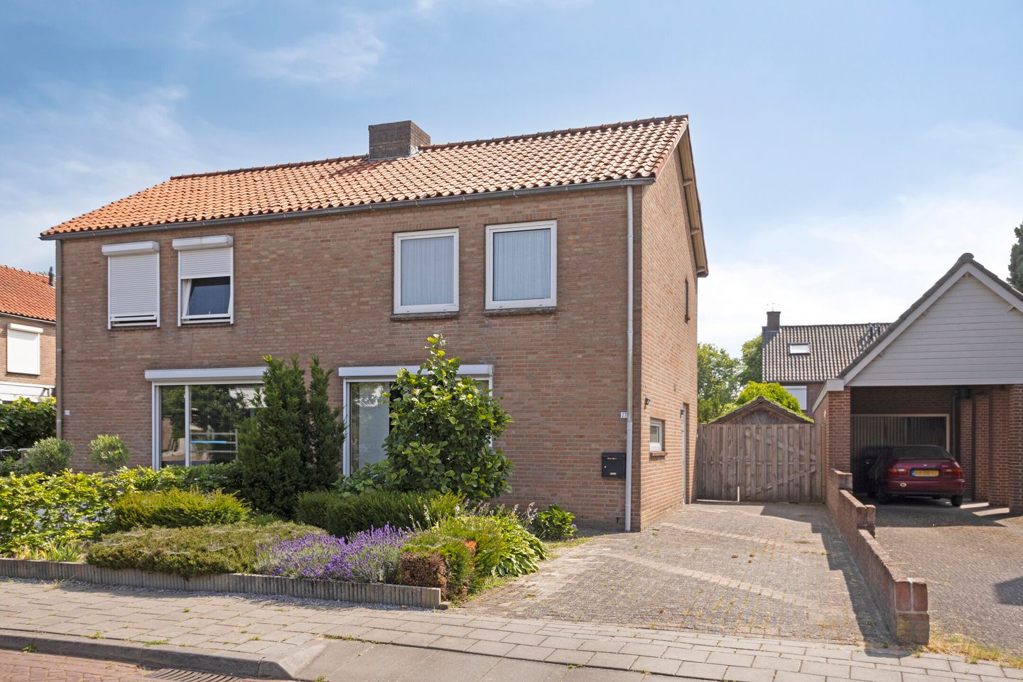 De voortuin is netjes aangelegd en er is een oprit die ruimte biedt aan 2 auto’s. Aan de straat is verder voldoende gelegenheid voor bezoek om te parkeren. Verder is er aan het einde van de oprit een brede poort die toegang tot de achtertuin biedt. Achterin de achtertuin, een beetje vreemd, staat een vrijstaande garage (deze is niet van hoge kwaliteit, en het ligt voor de hand om deze af te breken en elders te herplaatsen). De achtertuin is gesitueerd op het Oosten.