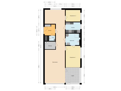 Vanuit de woonkamer is er directe toegang tot de keuken, loggia, badkamer en de twee slaapkamers.