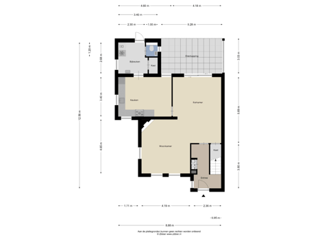 • N.B. De maatvoering, gebruiksoppervlakten en inhoud van deze woning zijn bepaald door een professioneel bedrijf en zijn gebaseerd op de Meetinstructie en de NEN2580. Ondanks alle zorgvuldigheid kunnen eventuele fouten niet uitgesloten worden, door meetfouten, interpretatieverschillen of beperkingen bij het inmeten. Daarom adviseren wij u dringend - indien de maatvoering, oppervlakten en/of inhoud voor u belangrijk zijn en/of bepalend voor de prijs – dit aan ons kenbaar te maken en deze meetgegevens te controleren. Wij willen u daarbij uiteraard graag helpen.
