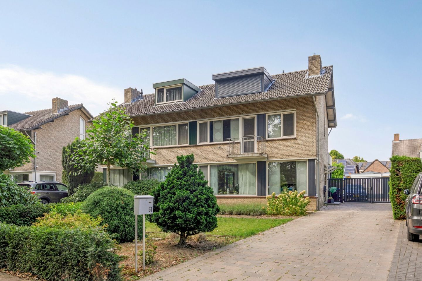 De woning heeft een royale voortuin met vaste beplanting, een fraai gazon en een handig watertappunt. Via de lange oprit, waar u meerdere auto’s kunt parkeren, bereikt u de achtertuin, die is afgescheiden met een stijlvolle dubbele poort.