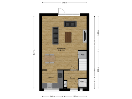 Via de entree komt u in de hal met meterkast, trapopgang en een separate toiletruimte met wandcloset en fonteintje. Vanuit de hal bereikt u de woonkamer, die zich over vrijwel de volledige diepte van de woning uitstrekt. Dankzij de grote raampartijen aan de achterzijde is er een fijne lichtinval. De woonkamer biedt voldoende ruimte voor zowel een comfortabele zithoek als een eethoek en beschikt over een praktische trapkast.