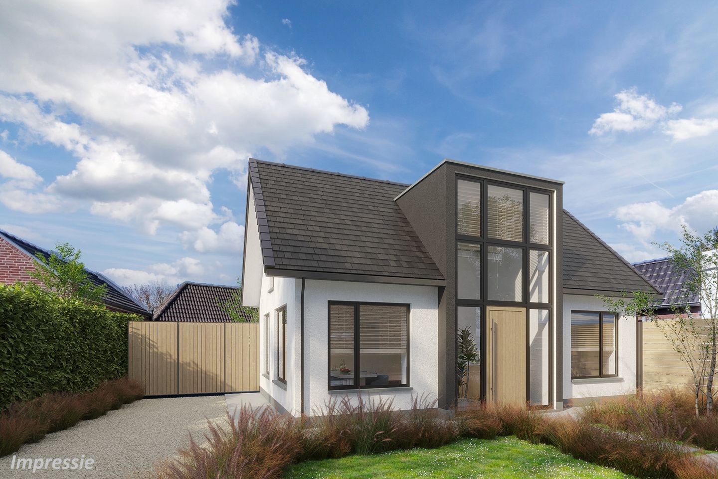Riante voortuin met een gazon en oprijlaan voorzien van siergrind en voldoende parkeergelegenheid voor meerdere personenauto’s.