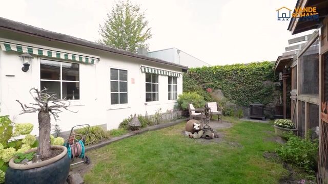 Entree naar de tuin met overdekt terras en kippenren.