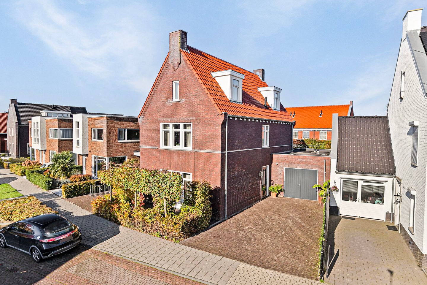 De tuin is via de linkerzijde vrij toegankelijk via een poort en heeft een aangelegde voortuin met bestrating, beplanting en een royale oprit aan de rechterzijde voor de garage. Aan de linkerzijde van het huis is de voortuin ook voorzien van bestrating, ideaal voor het stallen van fietsen.