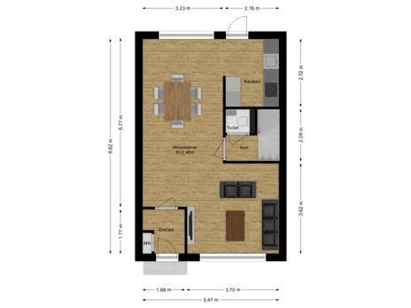- 69 m² (12,25 meter diep en 5,64 meter breed)