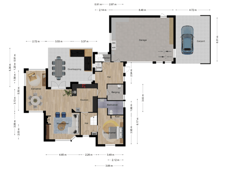 De woning beschikt over een royale dubbele garage van ruim 50 m², bereikbaar zowel via de hal aan de achterzijde van de woning als direct vanuit de achtertuin. De garage is voorzien van een elektrische deur, elektra en water, en biedt plek voor de opstelling van wasapparatuur. Naast de garage bevindt zich een handige overkapping, die volop mogelijkheden biedt voor extra opslag of een werkplek. Praktisch, flexibel en ideaal voor hobby’s of klussen.