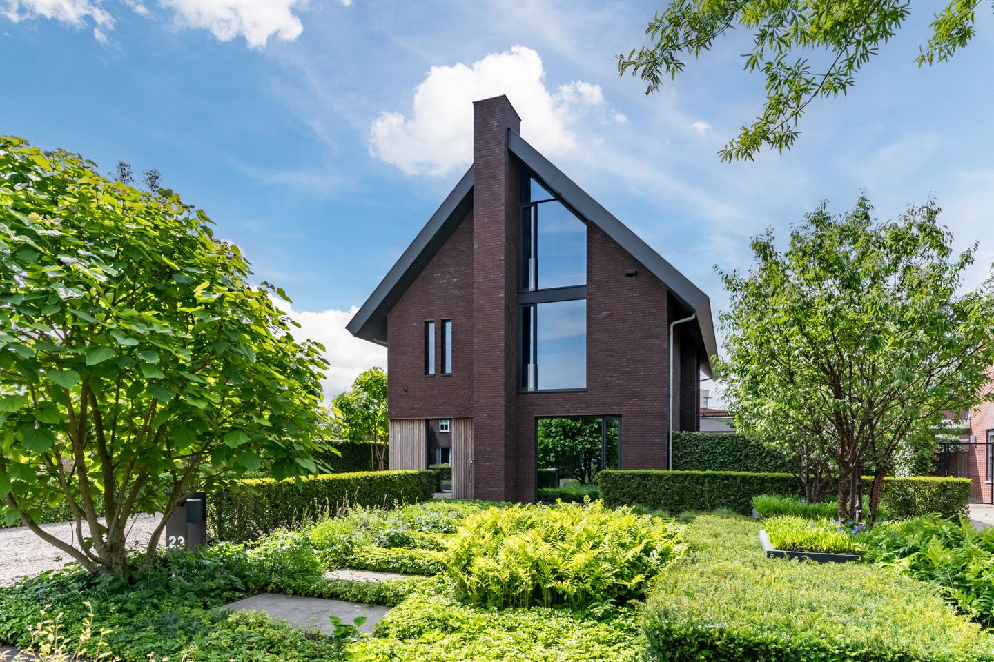 De brede oprit, afgewerkt met grind, biedt voldoende parkeergelegenheid voor meerdere auto’s op eigen terrein en loopt door naar de entree van de woning. De fraai aangelegde voortuin heeft een mooie mix van beplanting, strak geplaatste plantenbakken en verzorgde bestrating.