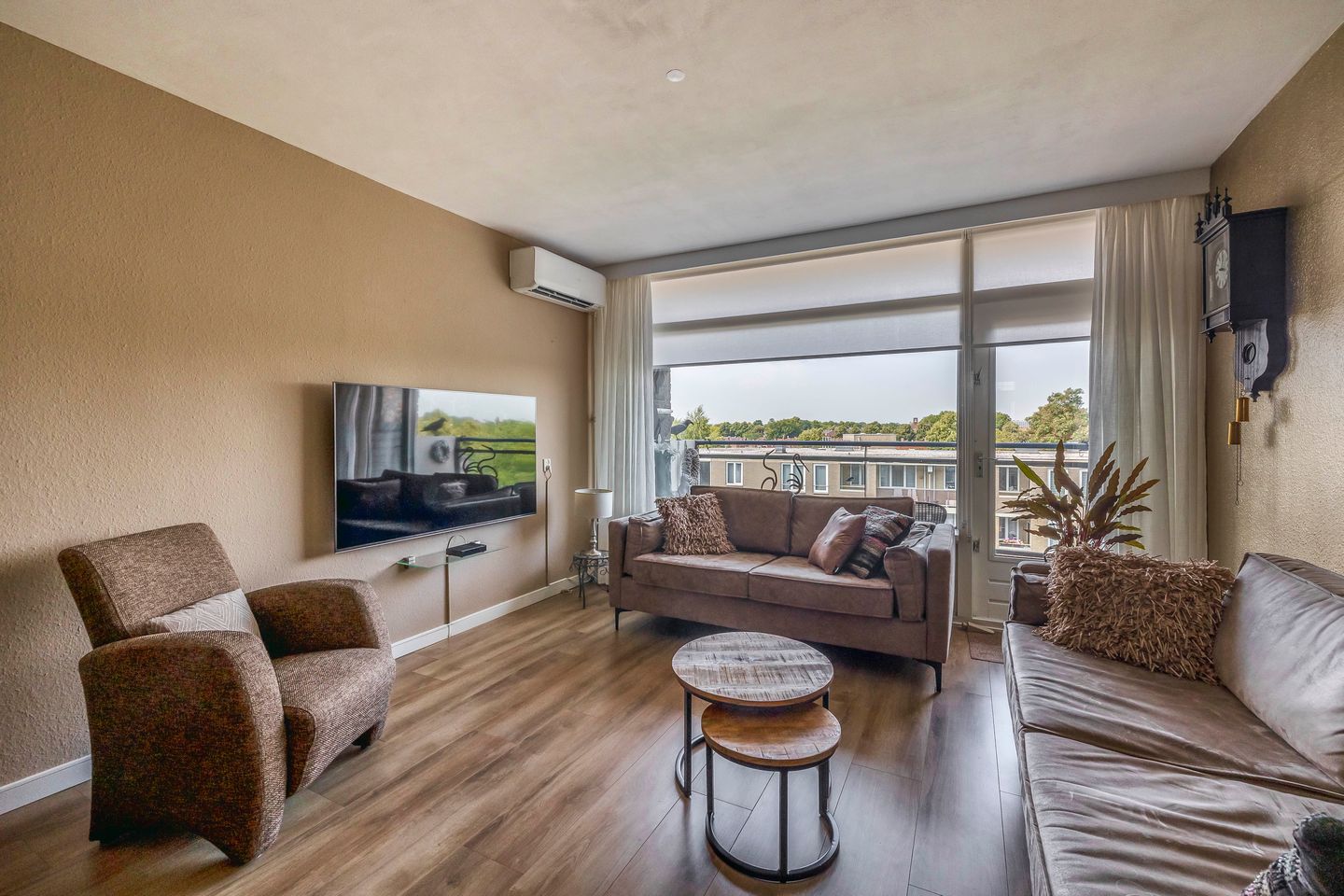 De ruime woonkamer (ca. 29m²) met airco biedt volop daglicht en toegang tot een heerlijk balkon (ca. 5m²) op het westen, compleet met elektrisch zonnescherm en vrij uitzicht. De half open keuken (ca. 7m²) is praktisch ingedeeld en beschikt over een 4-pits gasfornuis, afzuigkap en koelkast. Direct naast de keuken bevindt zich een handige berging met witgoedaansluiting en extra opbergruimte.