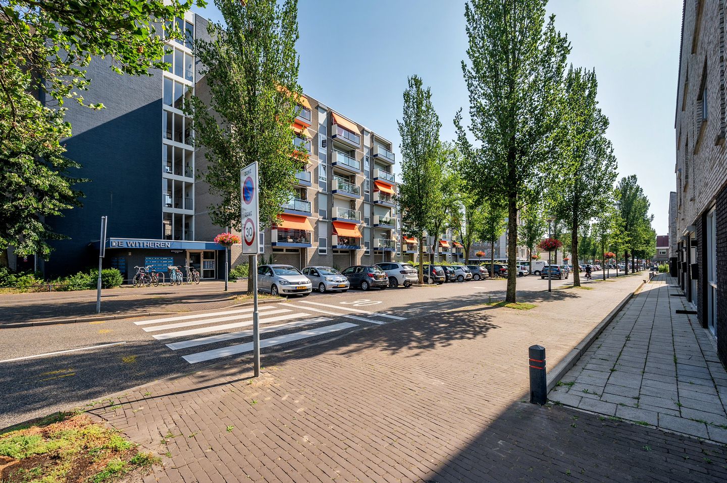 Entree, de hal, de gezellige woonkamer (ca. 29 m2) met een schuifwand van lamellen naar de slaapkamer gelegen aan de straatzijde, aangename airconditioning en een deur naar het balkon. Het balkon (ca. 5 m2), gelegen op het zuiden biedt fraai uitzicht over de Witherenstraat en is voorzien een elektrisch bedienbaar zonnescherm en houten vlonders. Aan de galerijzijde van het appartement is de keuken gelegen. De keuken (ca. 7 m2) is voorzien van een keurige keukenopstelling met een 4-pits gaskookplaat, een afzuigkap en een spoelbak. Via de keuken is de bijkeuken te bereiken. De praktische bijkeuken (ca. 2,5 m2) is voorzien van een tegelvloer en de wasmachine aansluiting. Via de woonkamer is het portaal te bereiken. Het portaal biedt toegang tot het gedeeltelijk betegelde toilet voorzien van een fonteintje, de badkamer en de slaapkamers (beiden ca. 12 m2). De geheel betegelde badkamer is voorzien van een douche en een wastafel. De hal, woonkamer, keuken, het portaal en de slaapkamers zijn voorzien van parket. De slaapkamer aan de galerijzijde is tevens voorzien van een grote, 4-deurs schuifkastenwand.
