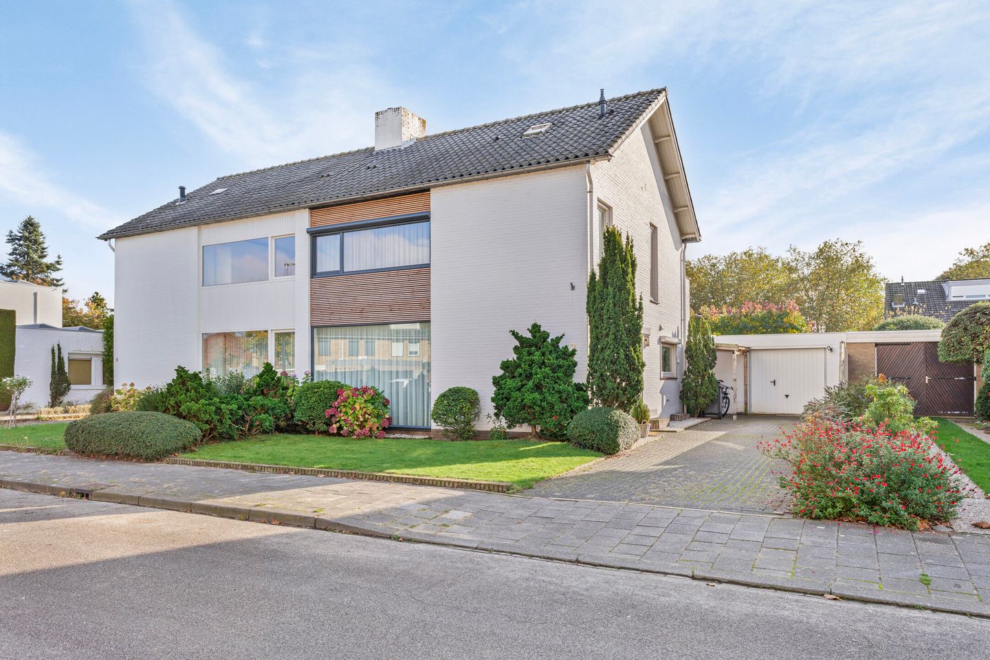 Keurige aangelegde voortuin met gazon en lange oprit met toegang tot de garage. De achtertuin is gesitueerd op het zonnige zuiden. Betegeld terras met elektrisch zonnescherm. De tuin is keurig aangelegd met gazon, groene hagen en er is een tuinhuis.