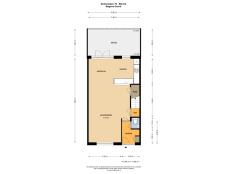 Entree, de hal voorzien van een tegelvloer, de meterkast, het geheel betegeld toilet met een fonteintje en doorgang naar de woonkamer. De ruime woonkamer (totaal ca. 40 m2) is voorzien van een tegelvloer, een praktische trapkast, de trapopgang naar de 1e verdieping, een deur naar de tuin en de verdekt opgestelde keuken. De keuken is voorzien van een keurige, L-vormige keukenopstelling (2002) met een 4-pits gaskookplaat, een afzuigkap, een oven, vaatwasser, koelkast, vriezer, een spoelbak en composieten werkblad.