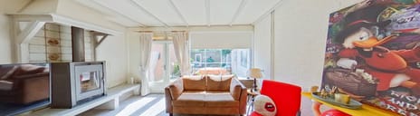 In de woonkamer ligt de vloer van de ontvangsthal doorgelegd. In de ruime woonkamer hebt u de beschikking over een houtkachel. Deze zorgt voor gezellige warmte. Door de grote raampartijen met hardhouten kozijnen, dubbel glas en elektrisch bedienbare rolluiken hebt u veel natuurlijke lichtinval. Via de openslaande deuren in de woonkamer komt u in de onderhoudsvrije achtertuin.