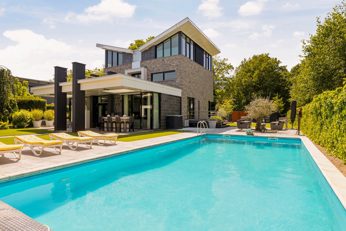 De vrijstaande villa ligt op een ruime kavel van 1.345 m². Het perceel is volledig omheind en biedt in de zomer volledige privacy. De onlangs aangepaste tuin is voorzien van een groot zwembad van 5 x 11 m. Het verwarmde zwembad heeft een springplank en een variabele diepte van 1,90 tot 1,30m. Aansluitend aan de woning is een ruim overdekt terras aanwezig over de volledige breedte van de woning. In de tuin is een aparte ruimte voor een 5 persoons jacuzzi. Deze staat op een betonnen vloer die afgedekt is met keramische tegels. Het perceel biedt de mogelijkheid tot het parkeren van minimaal 8 auto’s. Tevens is er een carport aanwezig voor 1 auto en een oplaadpunt voor 1 elektrische auto.
