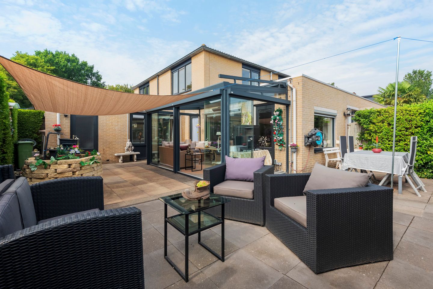 Middels de woonkamer is er een loopdeur naar de aangebouwde tuinkamer, deze is voorzien van glazen schuifwanden aan alle zijden, inbouw spots, een heater, screens en een elektrisch zonnescherm. Via een tweede loopdeur vanuit de woonkamer loop je direct de tuin in.