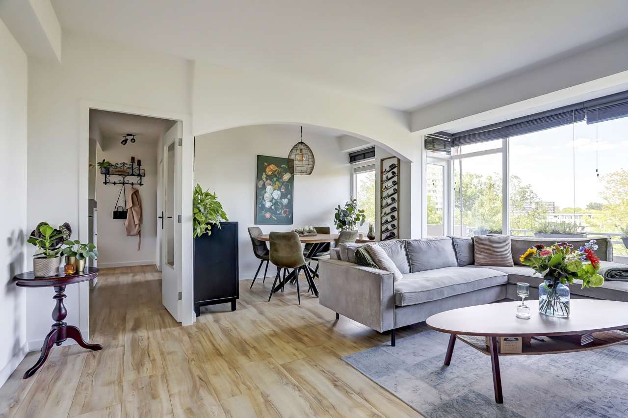 Aan het eind van de gang vinden we eerst de woonkamer. Door de grote raampartijen aan de westzijde van het appartement valt een oase aan daglicht binnen en heeft u een prima uitzicht over het vernieuwde winkelcentrum De Hoef.