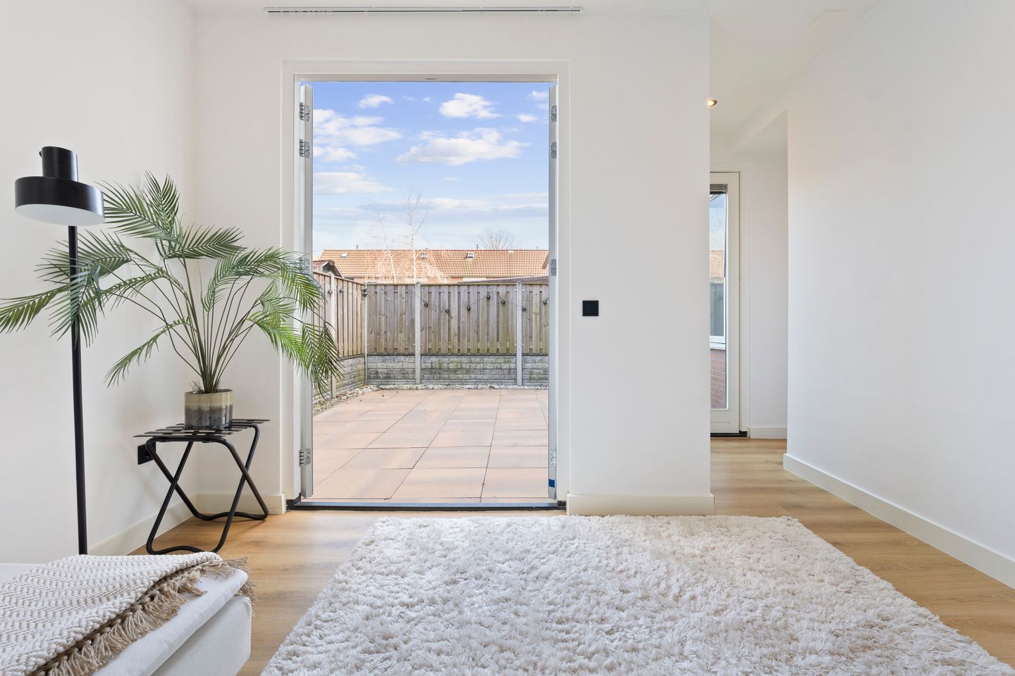 Wanneer je via de keuken verder naar achter loopt kom je in het aangebouwde gedeelte waar zich de woonkamer bevindt. Door de hoge plafonds, het dakraam en de openslaande deuren naar de tuin is dit een fijne ruimte. De woning beschikt verder over een modern video intercom deurbelsysteem, deze is te vinden naast de keuken. De tuin heeft een ‘achterom’ met een hek, dit is handig voor stallen van fietsen.