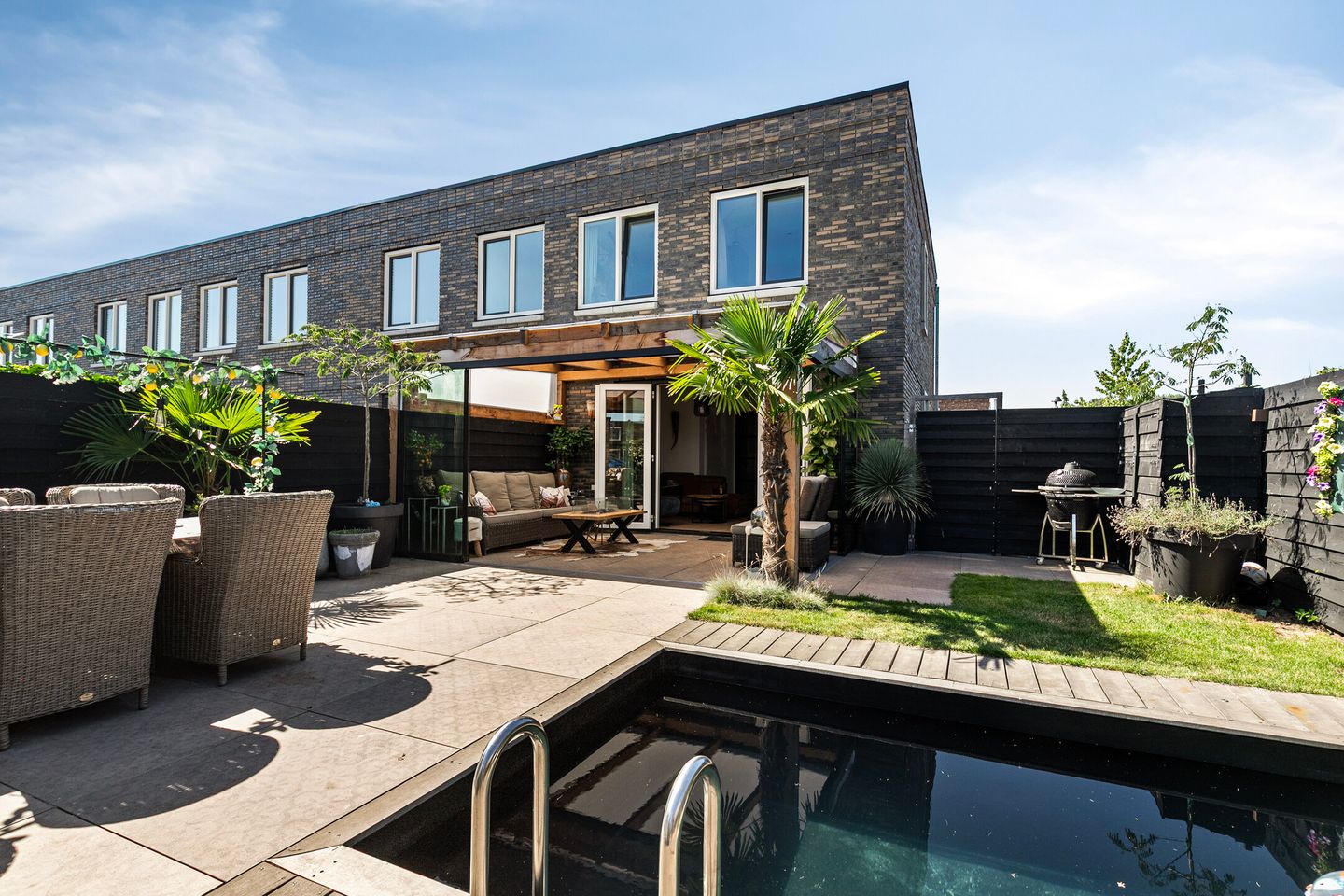 De tuin is verzorgd aangelegd en heeft een goede ligging op het zuidoosten. De tuin heeft een mooi formaat zwembad (chloorbad) met een trapje waar je heerlijk verkoeling kunt zoeken. De tuin beschikt verder over grote terrastegels, gras en is omheind met schuttingen. Via de oprit is de tuin toegankelijk en via de achterom. Er is een buitenkraan tegen de achtergevel.