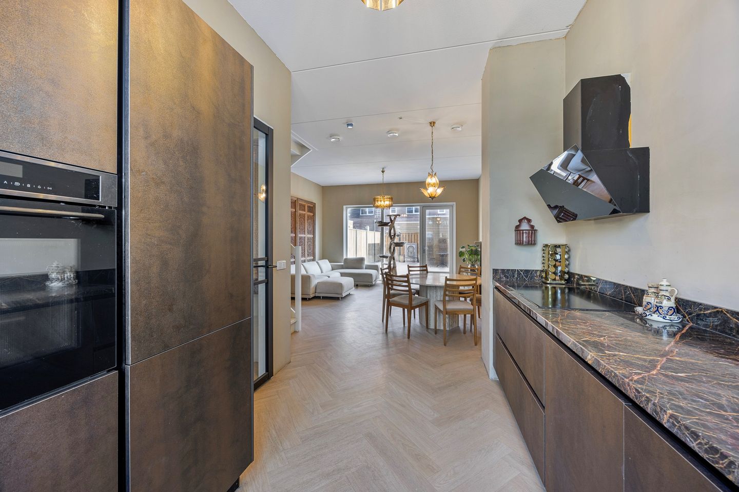 De luxe open keuken ligt aan de voorzijde van de woning is voorzien van een luxe marmeren aanrechtblad, inductiekookplaat, koel-vriescombinatie, vaatwasser en combi-oven.