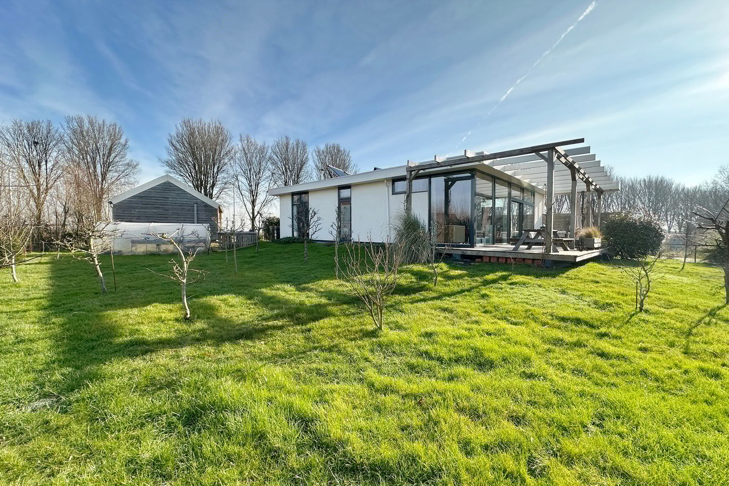 Wonen in Oosterwold is iets bijzonders: bouwen op zeer royale kavels, naar eigen inzicht, zonder welstand en zoveel mogelijk zelfvoorzienend en op en top duurzaam. Zo is ook op de hoek met de 'Paradijsvogelweg' deze speelse, doordachte en duurzame bungalow ontworpen en gebouwd in 2018 /2019, maximaal profiterend van het licht en het uitzicht op de weide omgeving. Een comfortabel huis van 129 m2 voor twee personen of een klein gezin. Aangevuld met een vrijstaand geïsoleerd guesthouse van bijna 37 m2, waar uitwonende kinderen kunnen logeren; of waar u kantoor / praktijk aan huis kunt houden of zoals in dit geval, een fraai atelier kunt inrichten. Naast het atelier ligt nog een grote houten schuur van bijna 20 m2, die eventueel ook eenvoudig is aan te passen tot garage.