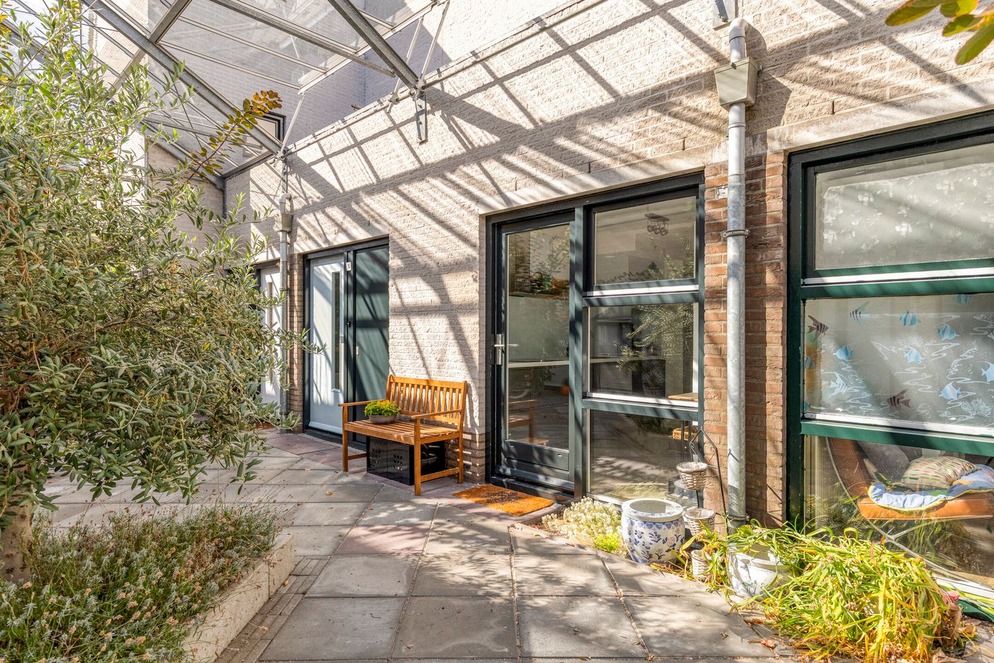 De woning ligt aan een sfeervol binnenterrein, de zogeheten serre, met een glazen dakconstructie die zorgt voor een beschutte, lichte en kindvriendelijke omgeving. Hier kunt u het hele jaar door comfortabel naar buiten, ongeacht het weer.