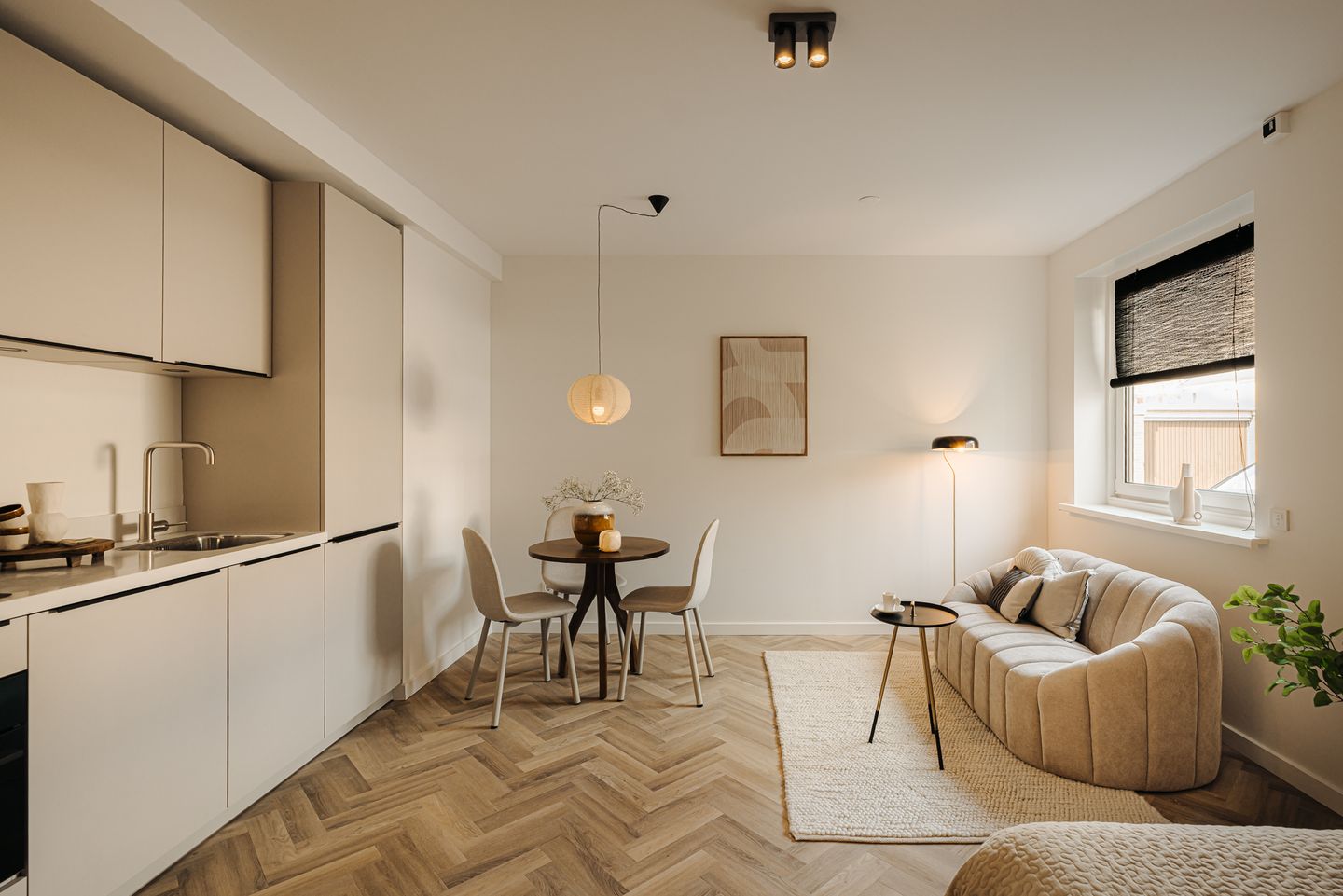 Je komt binnen via je eigen voordeur – geen gedeelde entree dus. De woning opent zich naar een strak afgewerkte leefruimte met plek voor een zithoek, eettafel en slaapgedeelte. De open keuken is modern uitgevoerd en voorzien van inbouwapparatuur.