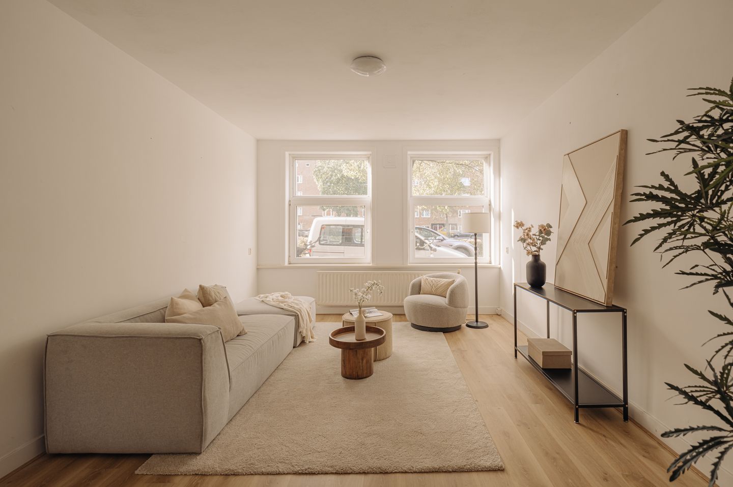 De bel-etage is thans in gebruik als een grote doorzon-woonkamer met open keuken. Aan de achterzijden bevinden zich openslaande deuren naar het balkon en de diepe tuin op het Oosten. De voorzijde is gelegen op het Westen en heeft derhalve heerlijke middag- en avondzon.