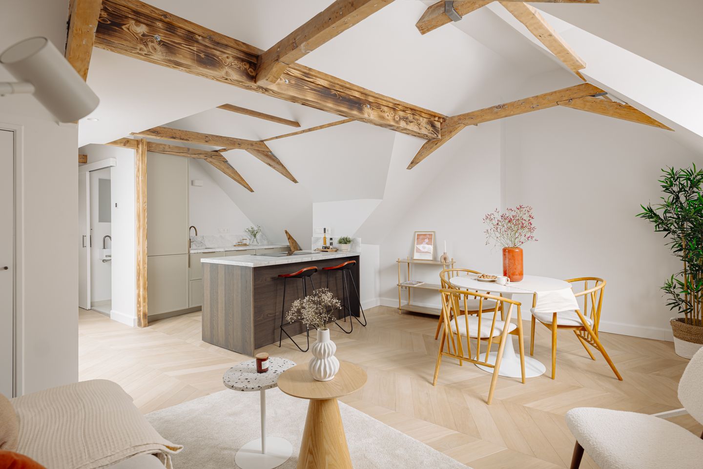 Bij binnenkomst van het appartement betreedt u direct de sfeervolle woonruimte. Dankzij de grote dakramen valt er veel natuurlijk licht binnen, terwijl de authentieke houten balken bijdragen aan de charmante uitstraling van het appartement. De woonruimte biedt plaats aan zowel een eethoek als een gezellige zithoek. Aangrenzend bevindt zich de moderne open keuken, uitgerust met een 4-pits inductiekookplaat met geïntegreerde afzuiger, vaatwasser, koel-/vriescombinatie, combi-oven en een Quooker.