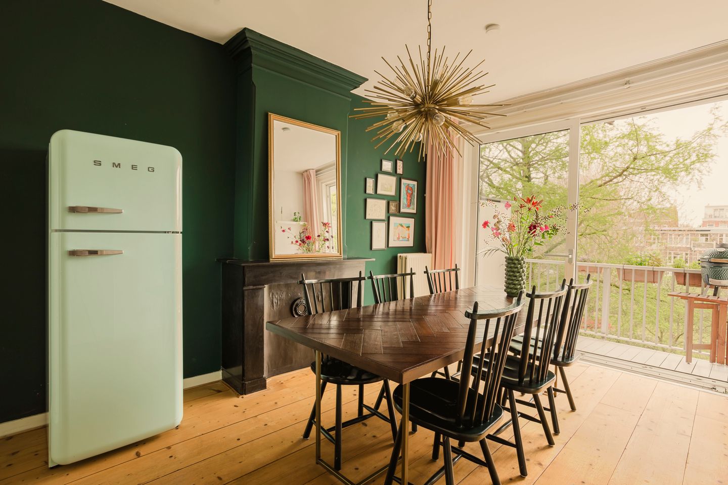 An atmospheric apartment in one of the nicest neighborhoods of Amsterdam with a beautiful unobstructed view at the rear. The house is light and well laid out with morning sun on the balcony at the front and afternoon/evening sun on the large balcony at the rear. The house has two bedrooms, a light wooden floor of wide pine planks and all door frames and paneling are equipped with the original wooden profiles. The dining room has a beautiful natural stone fireplace as a central eye-catcher. In short, a beautiful house with privacy and a view, located in a central location!