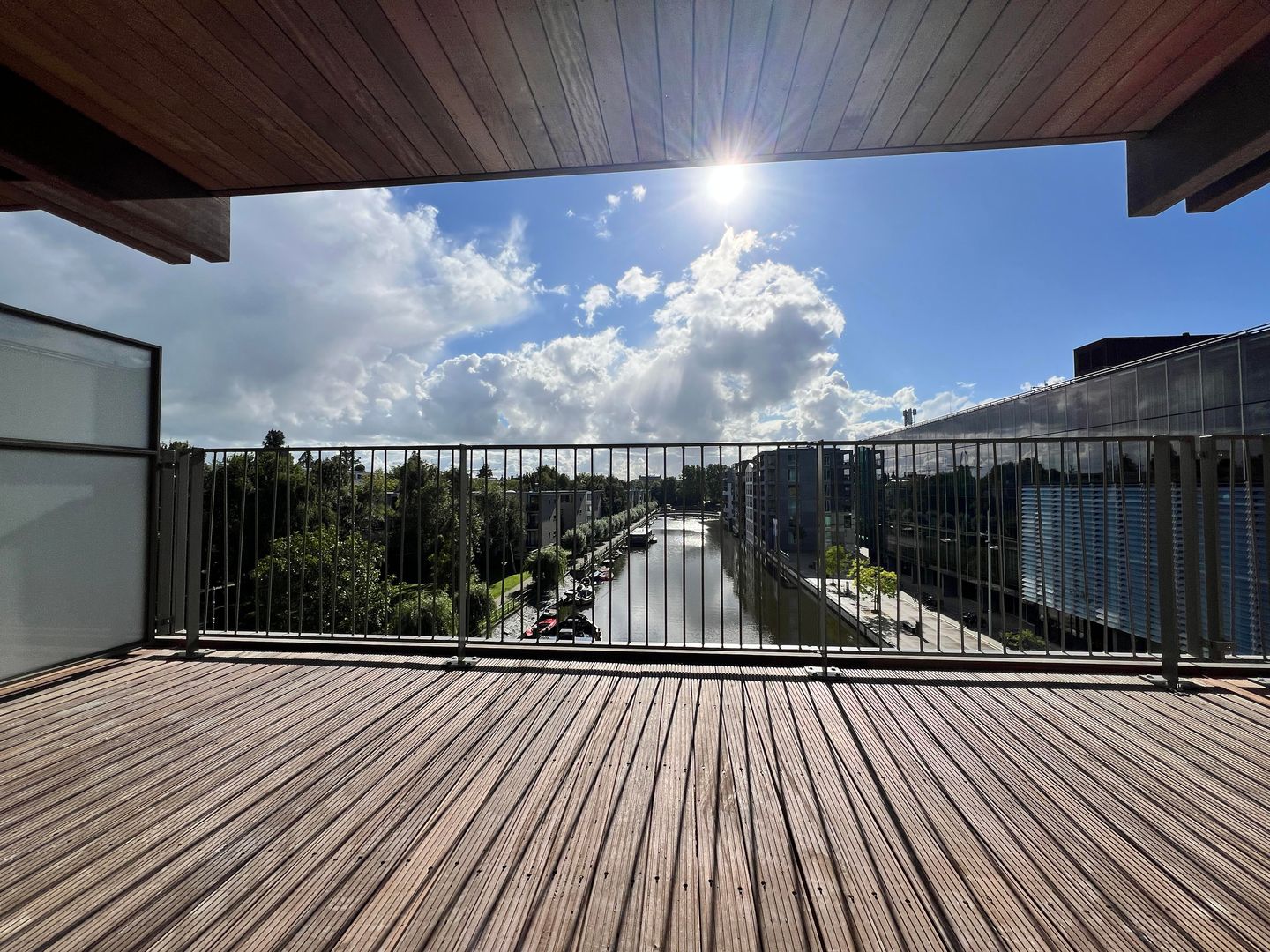 Het appartement bevindt zich op de derde etage in het midden van het gebouw met een riant terras van 11m2 op het Zuid-Westen dat vrij uitzicht biedt over de volle lengte van de Oostenburgervaart.