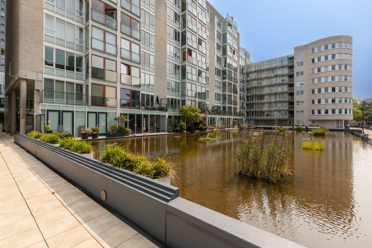 Between the large, tightly landscaped ponds, you will reach the central entrance of the De Hoefsmidt building. Here you can take the lift to the fifth floor. You enter the flat in the hallway with wardrobe space which provides access to all rooms. The internal storage/laundry room is located directly to your left. Here you will also find the district heating unit. To the right, the two well-sized bedrooms with lovely windows with shutters. The living room is very bright, partly due to the nice conservatory with ceiling-high windows and doors. The conservatory has floor heating and can be fully opened on the street side, creating an indoor balcony and offering a lot of privacy. No fewer than six large windows offer lovely views over the promenade (Amstel Boulevard). The open kitchen is modern and equipped with various (built-in) appliances, including an induction hob, fridge-freezer, dishwasher, extractor and combi oven. The modern bathroom has a Whirlpool bath, double washbasin with cabinet, toilet, enclosed shower with rain shower and underfloor heating. The flat has beautiful panel doors, tightly plastered walls and ceilings and wooden floors. In the basement, this flat has its own storage room.