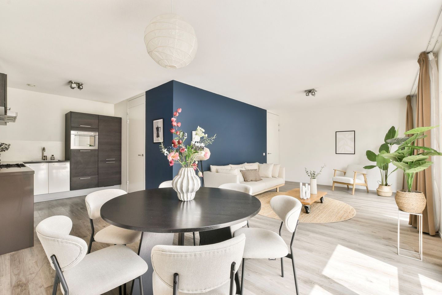 De halfopen keuken sluit naadloos aan op de woonkamer en is voorzien van moderne inbouwapparatuur. Aangrenzend bevindt zich een praktische bijkeuken met aansluitingen voor wasmachine en droger.