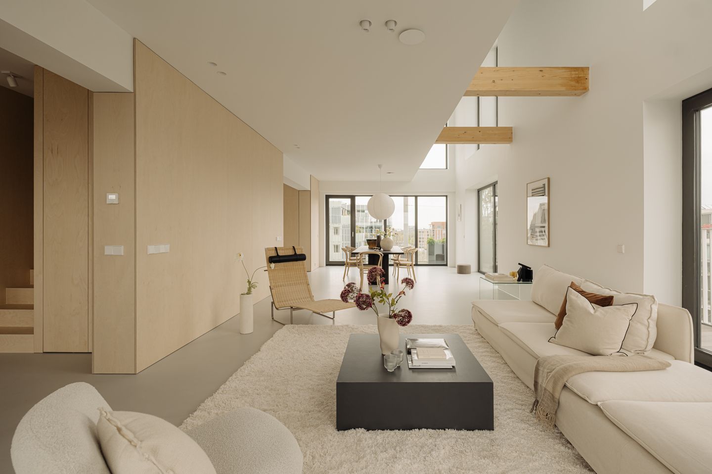 Centraal op deze verdieping ligt een open vide met zicht op de woonlaag daaronder. Deze lichte ruimte leent zich uitstekend als thuiswerkplek of tweede zitkamer. Ook op deze verdieping is de sfeer minimalistisch, met natuurlijke materialen, vloeiende zichtlijnen en een perfect lichtinval.