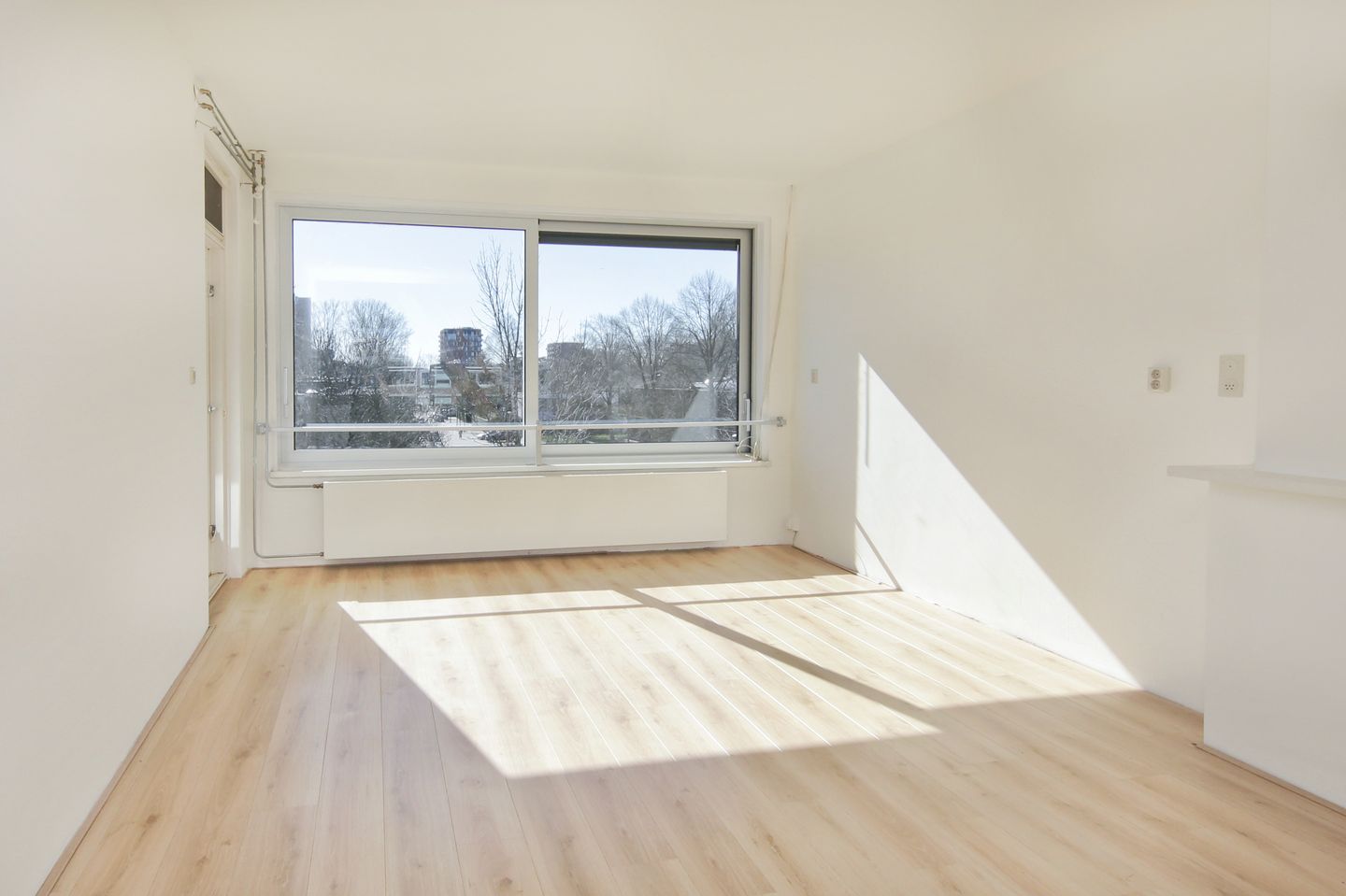 Entree, ruime hal van circa 7 m² met deurintercom, meterkast en toilet en deuren naar alle vertrekken. Doorzon woonkamer van circa 40 m² met grote raampartijen, toegang tot het op het zuiden gelegen balkon met vrij uitzicht en een open keuken met nog aan te vullen keukenopstelling. Aan de achterzijde van de woning bevinden zich twee slaapkamers, een van circa 8 m² met vaste kast en een van circa 11 m², beiden met toegang tot het balkon. Aan de voorzijde is slaapkamer drie van circa 5 m² met een vaste kast met cv-optelling en de badkamer van circa 6 m² met inloopdouche, wastafel en toilet. Via een vaste trap in de woonkamer is de 4e verdieping bereikbaar.