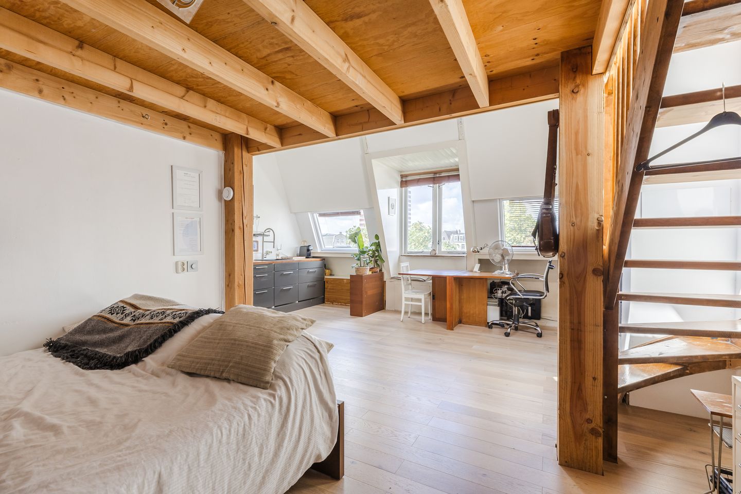 The highest point of the apartment reaches no less than 4.80 meters, making it possible to create a mezzanine. This offers ample space for a sleeping area, as well as an additional sleeping spot below the mezzanine. Storage space has also been created here.
