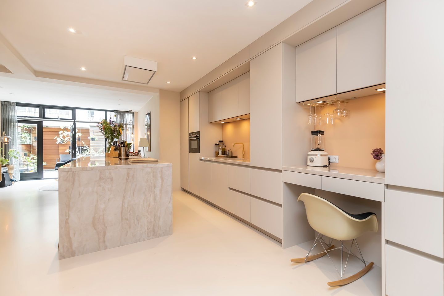 De lichte woonkamer met open keuken vormt het hart van het huis. De keuken is twee jaar geleden volledig vernieuwd en voorzien van alle denkbare luxe en gemak. Ze vormt op deze manier het kloppend hart van elke familie en kookliefhebber! Net als de rest van de keuken is het stijlvolle kookeiland is rondom afgewerkt met dekton marmen bladen en voorzien van Miele inbouwapparatuur. De gouden Quooker is tevens uitgevoerd met bruisfunctie.