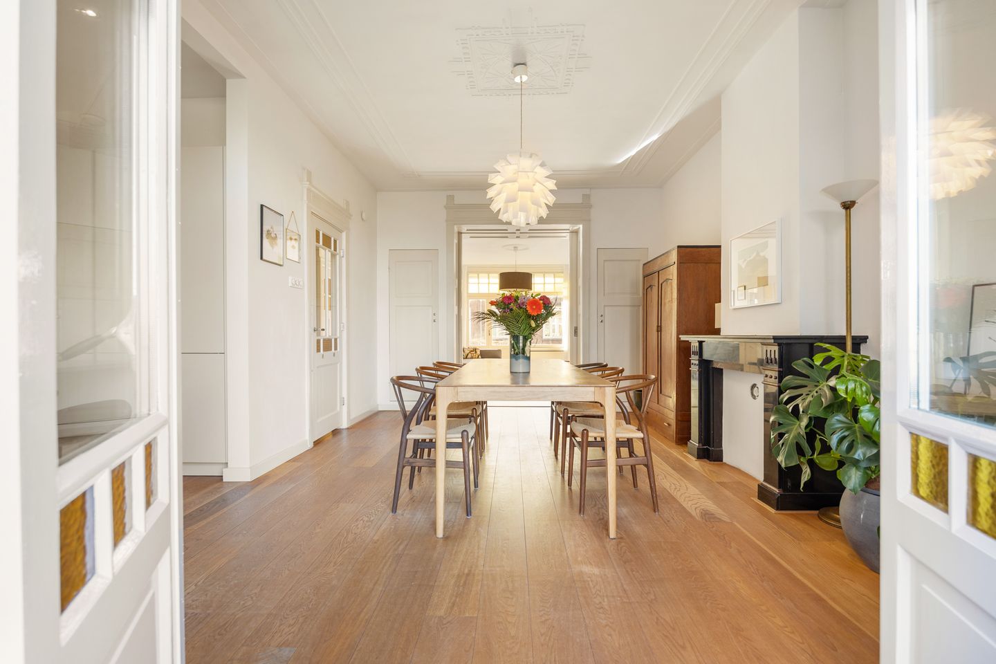 De en suite woonkamer heeft originele ornamentenplafonds met zowel in de voor- als achterkamer zwarte schouwen, de "en suite" schuifdeuren en inbouwkasten. Aan de straatzijde de lichte en ruime (ca. 21 m²) living met Frans balkon en aan de achterzijde de eetkamer grenzend aan het balkon. Eveneens aan de voorzijde ligt een extra kamer, nu in gebruik als werkkamer. De luxe open keuken (2018) bevindt zich aan de achterzijde, uitgerust met hoogwaardige inbouwapparatuur en een stijlvol kookeiland met Bora inductiekookplaat.