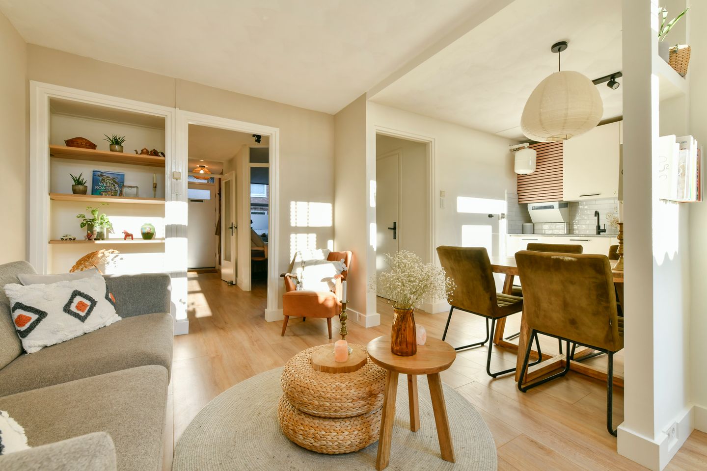 Aan de achterzijde ligt de sfeervolle woonkamer met aangrenzend de open keuken. De keuken beschikt over veel bergruimte en diverse inbouwapparatuur zoals een vaatwasser (2023), gasfornuis, oven en een losse koelkast met vriezer. Vanuit de woonkamer én de keuken is de netjes verzorgde tuin, gelegen op het zuiden, te betreden. Berging in de tuin van 4m².