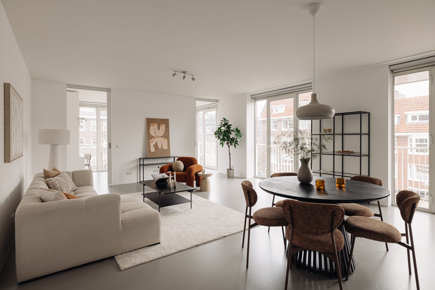 Upon entering the apartment, the open layout immediately stands out. The continuous poured floor and sleek wall finishes create a sense of unity and a calm, modern aesthetic. The living room is positioned at the front of the property and features wide windows with pleasant natural light. Thanks to its corner position, the apartment enjoys open views over the street and surrounding buildings.