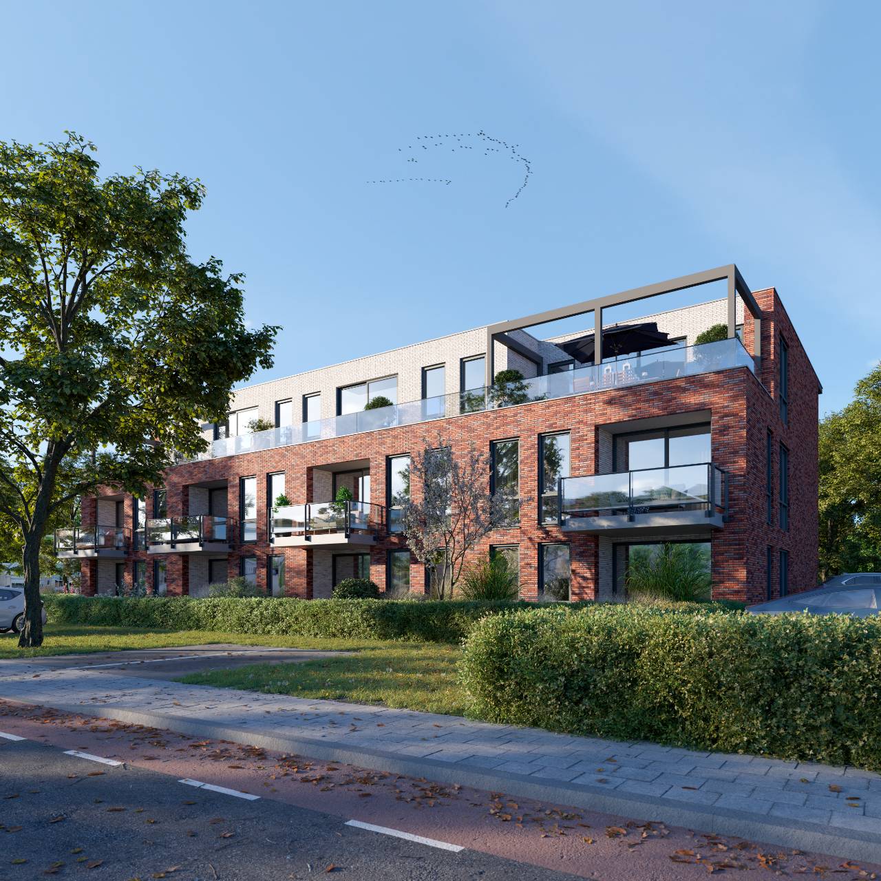 These spacious three-room apartments come standard with two bedrooms, a fully equipped bathroom and a separate toilet. The large living room with an open-plan kitchen (kitchen not included) opens onto a balcony or a spacious terrace. Inside the apartment, you’ll find a storage room perfect for use as a laundry space, and an additional private storage room is located outside the building.